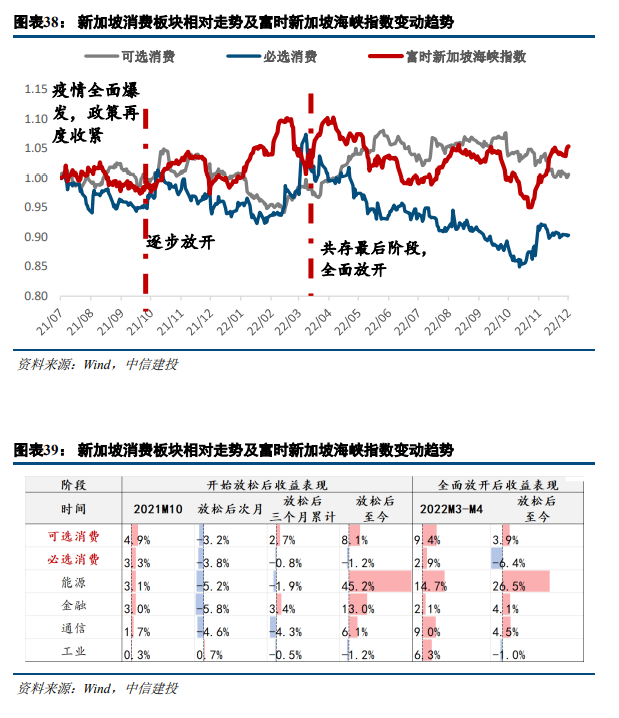 股市表现上,初步放开(21年10月)当月消费明显反弹,后因疫情反复扰动跑输;22年初Omicron冲击渐退后,随着消费稳步复苏可选录得长达近四个月的相对收益,必选提前急涨近一个月后则扭头下行。21年10月初新加坡总理李显龙表示,新加坡将重新与世界接轨,安全重开边境。政策放松当月后新加坡消费指数大幅反弹、超额收益显著,但因疫情仍反复扰动,直至22年初Omicron大规模爆发,消费指数整体超额并不明显。22年3月起,随确诊病例渐退、疫情症状不断减轻、整体消费重新展现良好复苏趋势,可选/必选消费均迎来较大程度的反弹,可选行情持续近4个月,必选则提前急涨1个月后便扭头跑输。