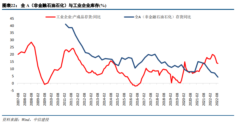 2022年整体A股处于盈利下行周期,库存/PPI同比高位回落,年末或面临资产减值损失风险。截至22Q3全A(非金融两油)归母净利润单季同比-1.73%,相较22Q2单季同比变动+0.35pct,库存周期(量)/PPI同比(价)/PMI6个月移动平均数据均指示A股盈利仍有继续下滑压力。量的层面跟随库存周期,当前依旧高企,未来半年复苏弹性有限;价的层面上,PPI同比企稳回升大致亦会出现在明年中。