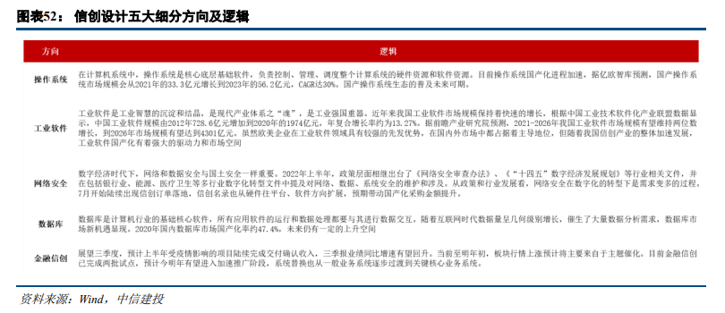 “十四五”规划纲要为信创产业发展指明方向,提出加强关键数字技术创新应用,聚焦高端芯片、操作系统、人工智能关键算法、传感器等关键领域,加快推进基础理论、基础算法、装备材料等研发突破与迭代应用。22年受疫情影响信创采购量不及预期,近期79号文指导国资信创产业发展和进度,新增2023年量化要求,预计2022年底各行业将制定未来五年的替换计划。信创产业发展有望在行业层面加速推进,尤其电力、金融、电信、交通、物流等重点行业的信创替代。