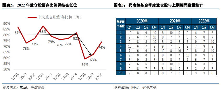 生态迭变,适者优胜。船小好调头,但领先的大基金重仓股换仓频率也开始加快。我们选取每年的代表性基金(50亿元规模以上的收益率前十名)从其前十大重仓股的季度更换频次来看,2020-2021年表现最优异的大规模基金其上个季度前十大重仓股的7-8只会留到下个季度,而这个比例已降至5-6只,代表性基金持股周期更短,换手率更高。该现象充分说明了2022年躺赢越来越难,动态配置“运动战”成为机构不得不面对的选择。