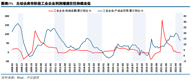 库存周期反转下企业盈利复苏。当前中国经济按照库存周期阶段划分,自今年4月以来一直处于主动去库存阶段,预计有较大可能在明年二季度结束主动去库存进入被动去库存阶段。从历史经验来看,主动去库存阶段工业企业利润增速往往持续走低,这是因为除了需求疲弱外,不断下行的PPI也导致企业面临存货减值的风险,这进一步推升了去库需求并压制盈利复苏进程。通常来说,企业盈利将领先于产成品库存的见底回升,考虑到今年二季度疫情形成的低基数,我们预计企业盈利的回升最早将在明年二季度出现。