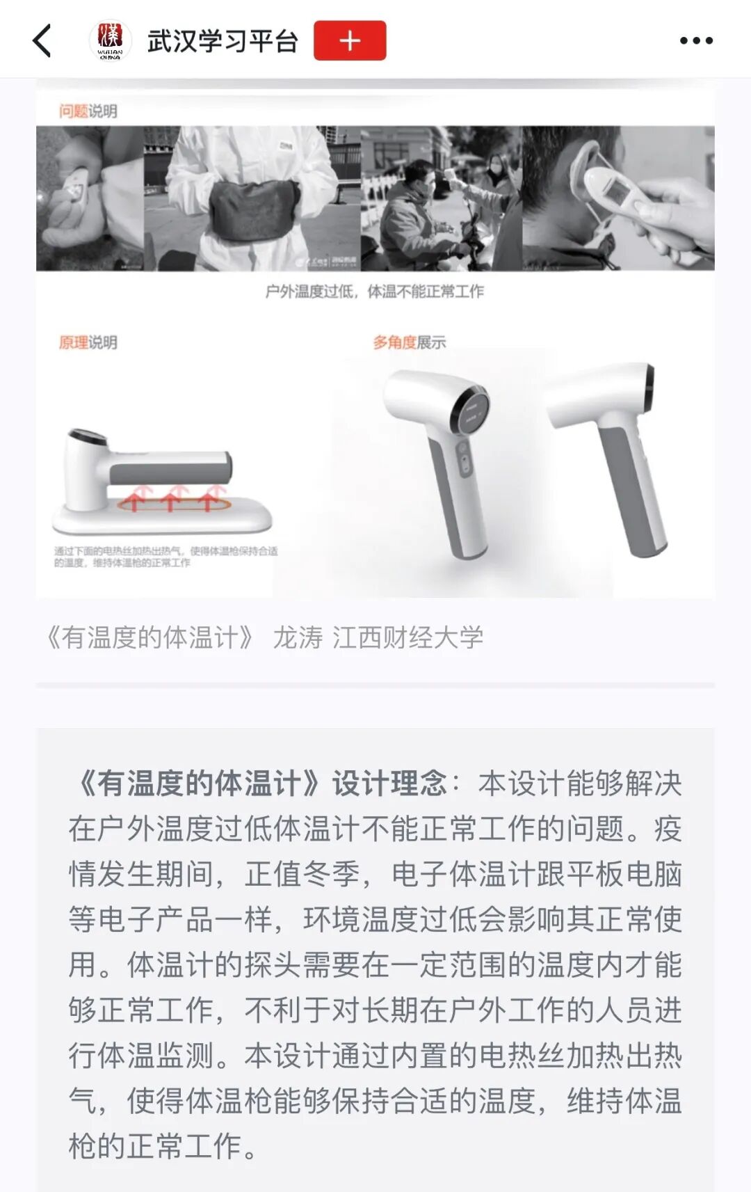 艺术学院303产品创新设计工作室的全体学生成员极早地就启动了设计战“疫”活动,依托所学专业贡献设计智慧。他们积极参与了此次战“疫”设计活动,将作品投递给主办方,其中,龙涛同学的设计作品《有温度的体温计》在众多作品中脱颖而出,被“学习强国”评选为优秀作品代表,并刊登平台。
