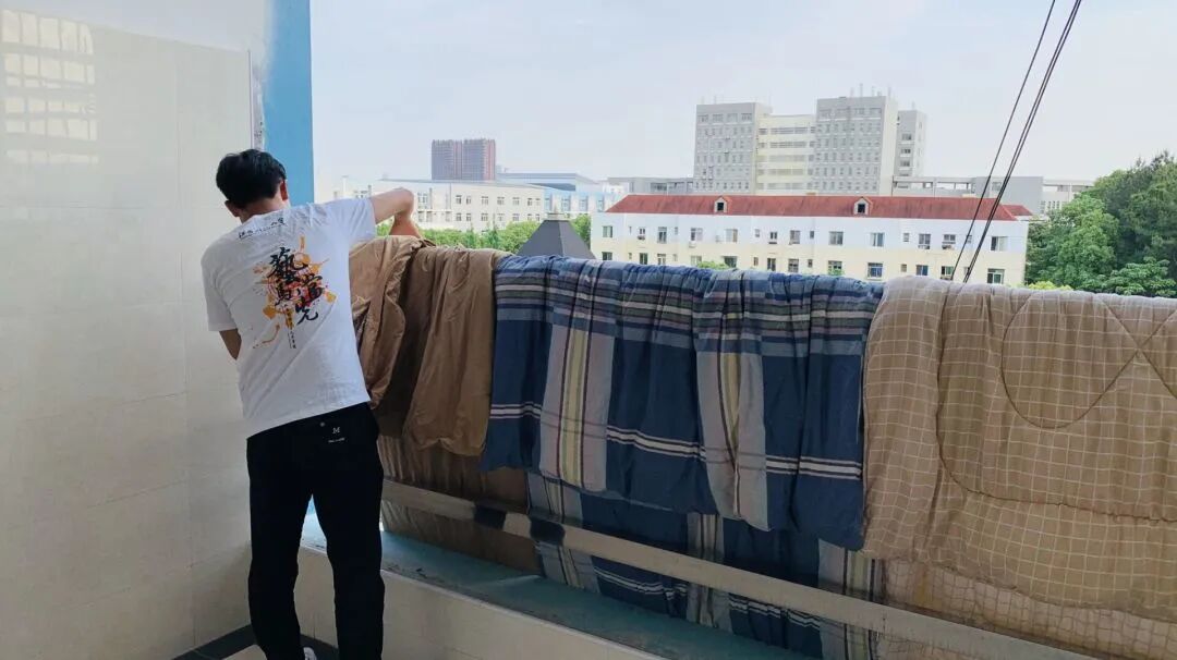 5月12日,爱心助力活动进行中,19产品设计2班张皓禹同学上午在宿舍楼里外忙碌起来,打开宿舍窗户后,一双双被子被他送到太阳下。