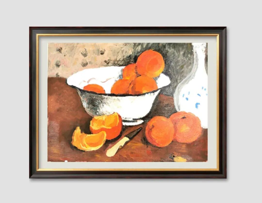 黑色远观加橙黄为背景衬托灰黄色盆子,更突出橘红色的橘子,沙丘小,橘子红,丰收之情跃然画中,显示着生活的美好。