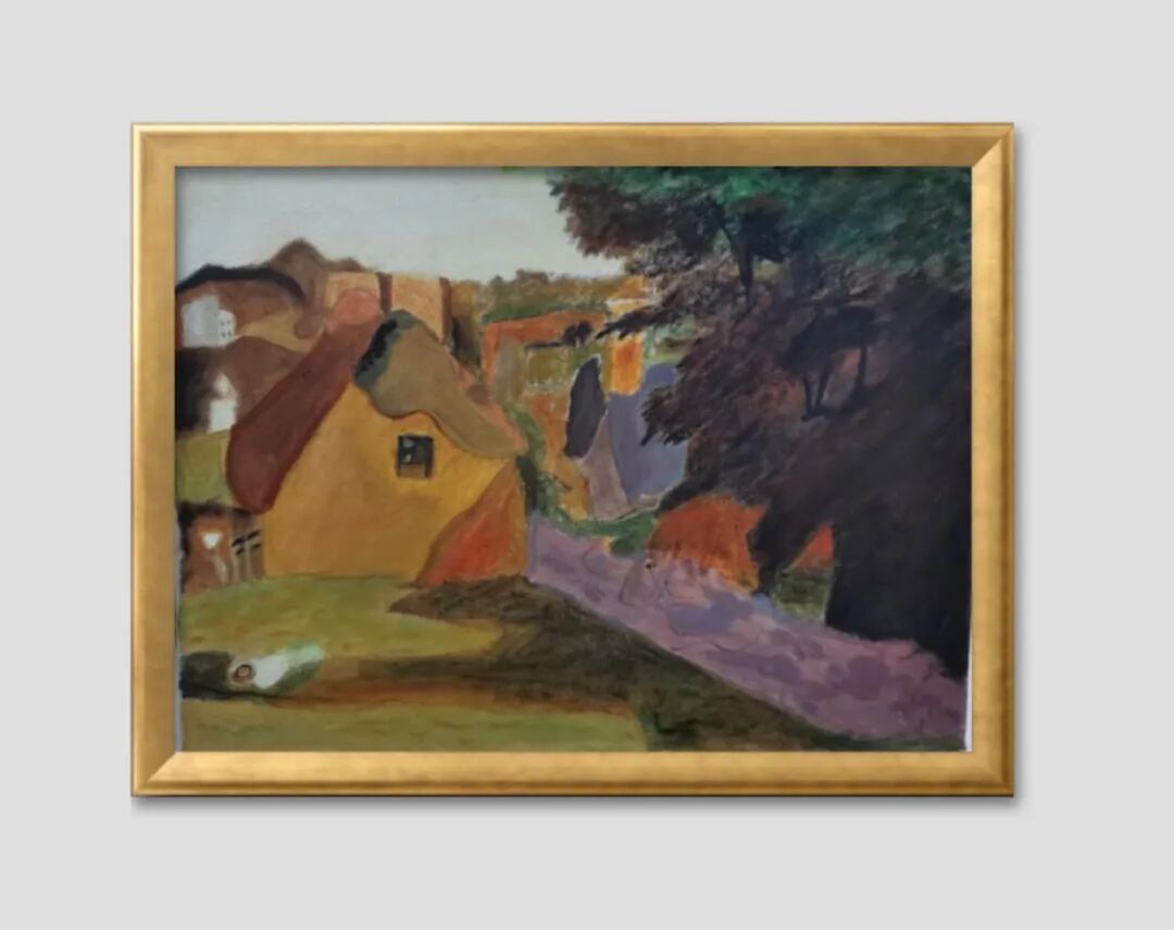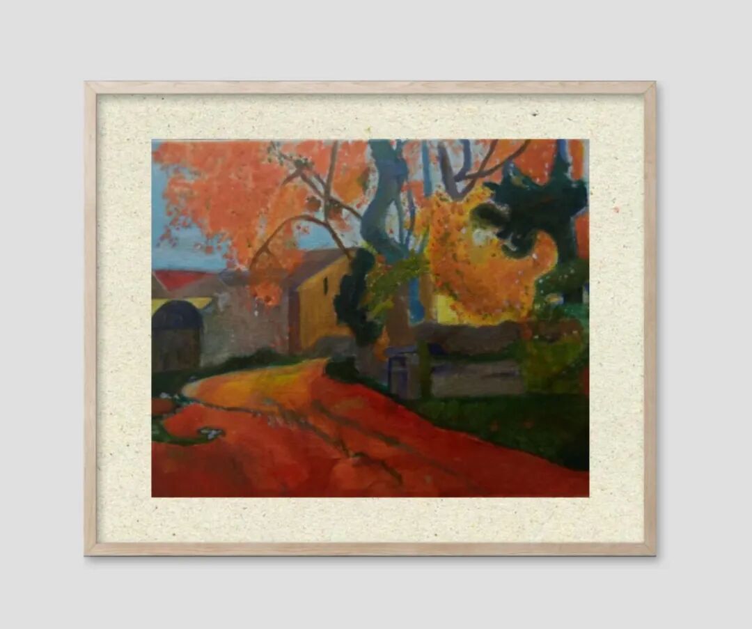湛蓝的天空下,暧暧村落边,一条橘黄色的乡村小路延伸过去,路边一颗孤树挺立着,茂盛的杂草生长在路边,一切都是那么的宁静祥和。给人一种和谐统一的感觉,让人不由自主的想像自己生活在这一个优美的环境。
