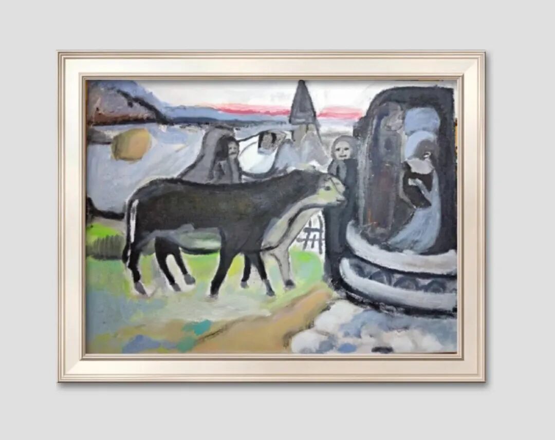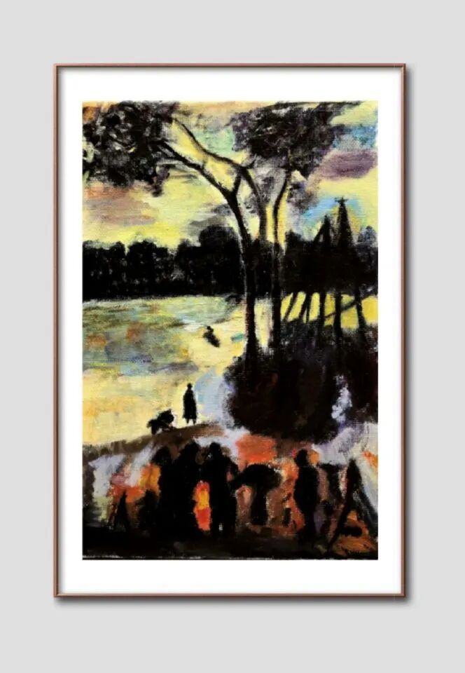 这是一条平静的小河,蜿蜒流过绿茸茸的牧场,与郁郁的树荫交相掩映,直到最后泻入烟波浩渺的河流中。而烤火的人融入在黄昏中,享受在无关世事的平静之中。