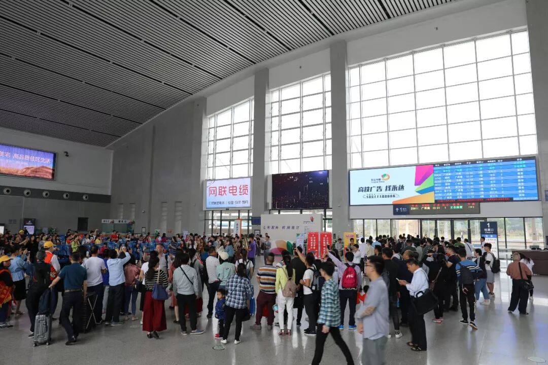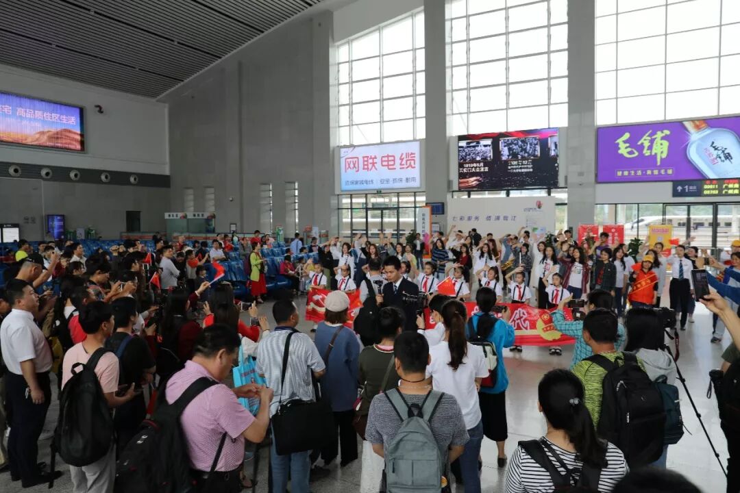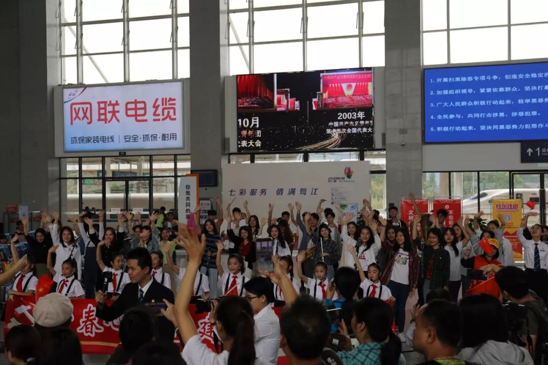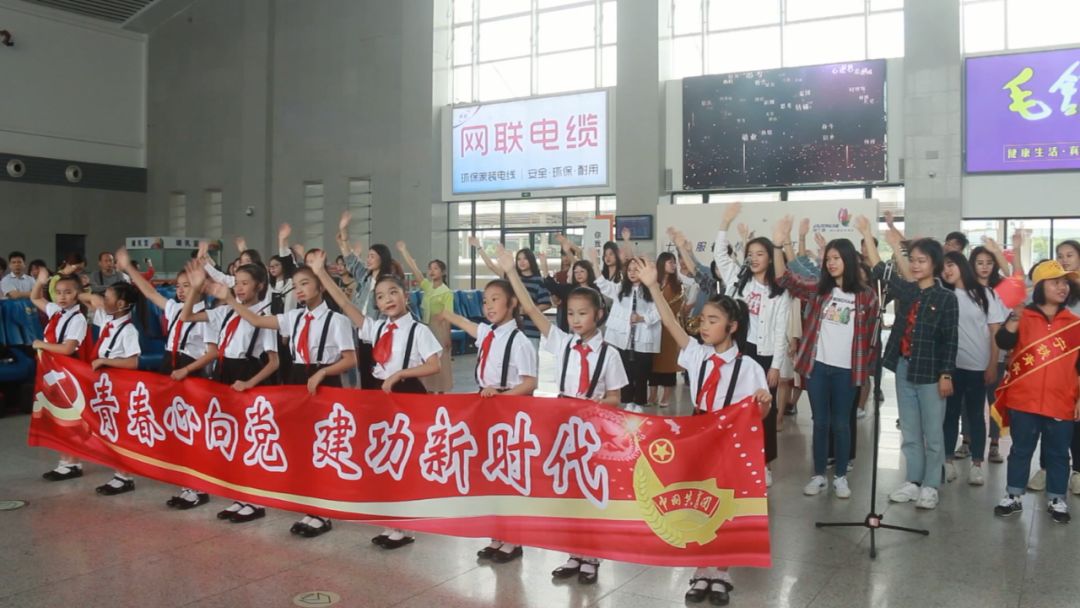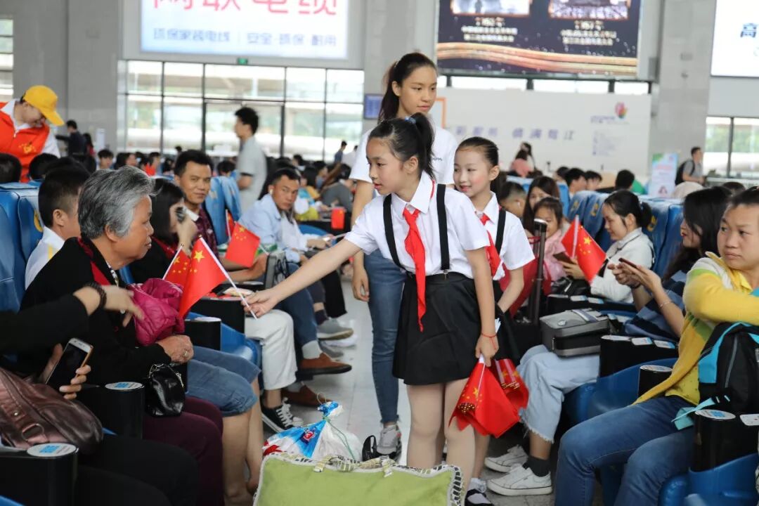团员青年和小学生向在场的旅客朋友们分发五星红旗,传递少先队员对祖国的热爱之情。同时,用银铃般的歌声向先辈致敬。