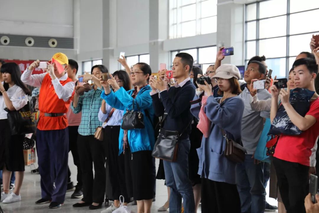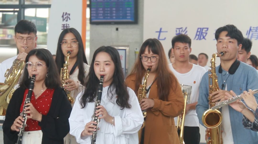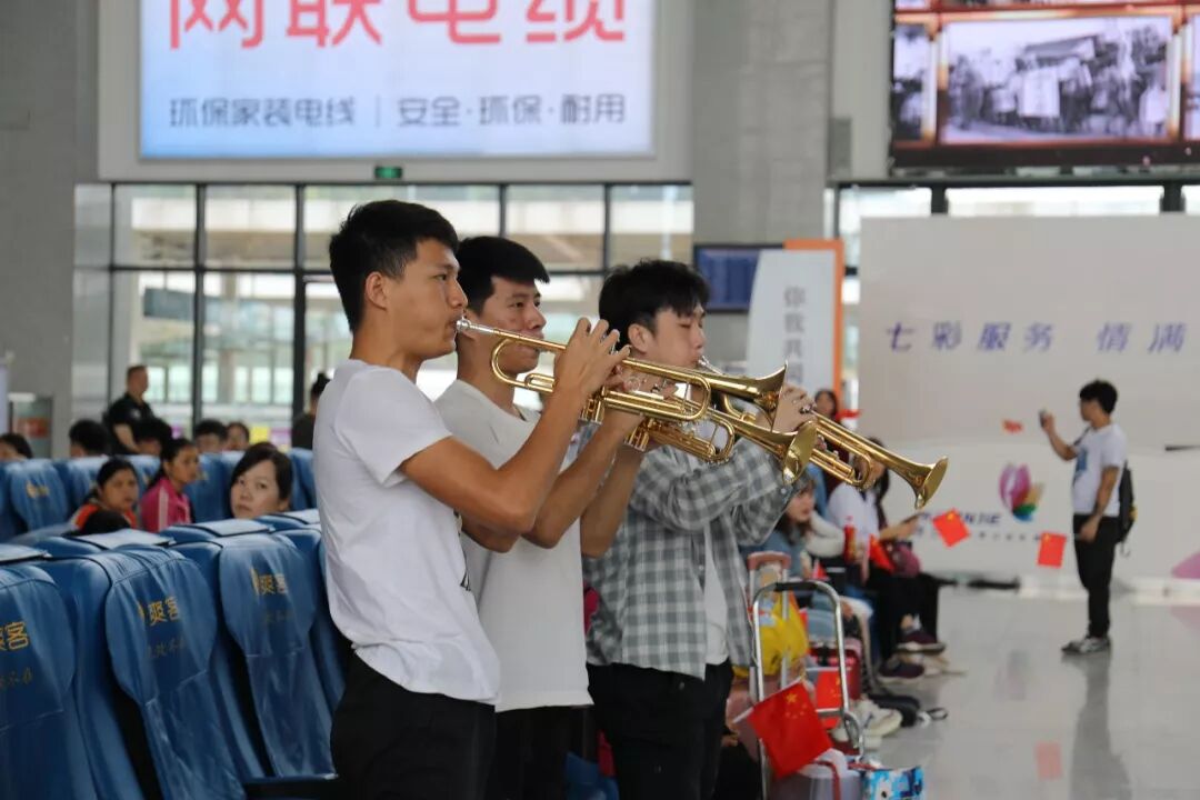 20多名管乐队表演者演奏激昂的《歌唱祖国》从四周汇聚到候车大厅中央,让大家格外惊喜。管乐器恢宏的音色让现场氛围更庄严隆重,燃起浓浓的爱国热情。