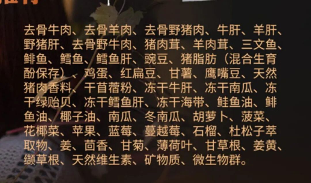 3、原料清晰明了,具体啥物种的肉粉要写明。
