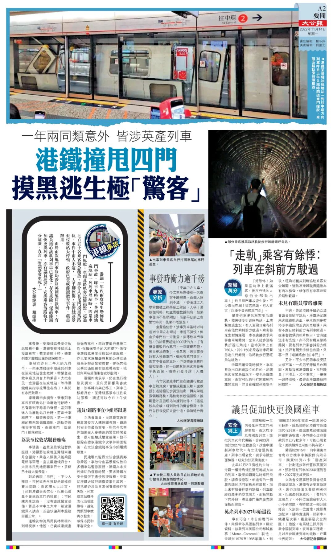 公平而言,港鐵服務質素總體水平不差,在國際上甚有口碑,值得信賴。但另一方面,必須看到港鐵近年大小事故不斷,2019年發生的列車嚴重相撞事故,至今令人猶有餘悸。種種意外不可避免地影響港鐵的形象。有關方面千萬不要因為沒有發生死傷事故就掉以輕心,以「偶然」、「突發」作自我安慰,也不能僅僅是罰款了事,必須舉一反三,作系統檢討。不管怎麼說,安全不是口號,今次事故再次敲響安全警鐘,必須嚴肅對待,既要找出事故原因,更要回應在管理層面如何改善,如此才能強化市民對港鐵的信心。