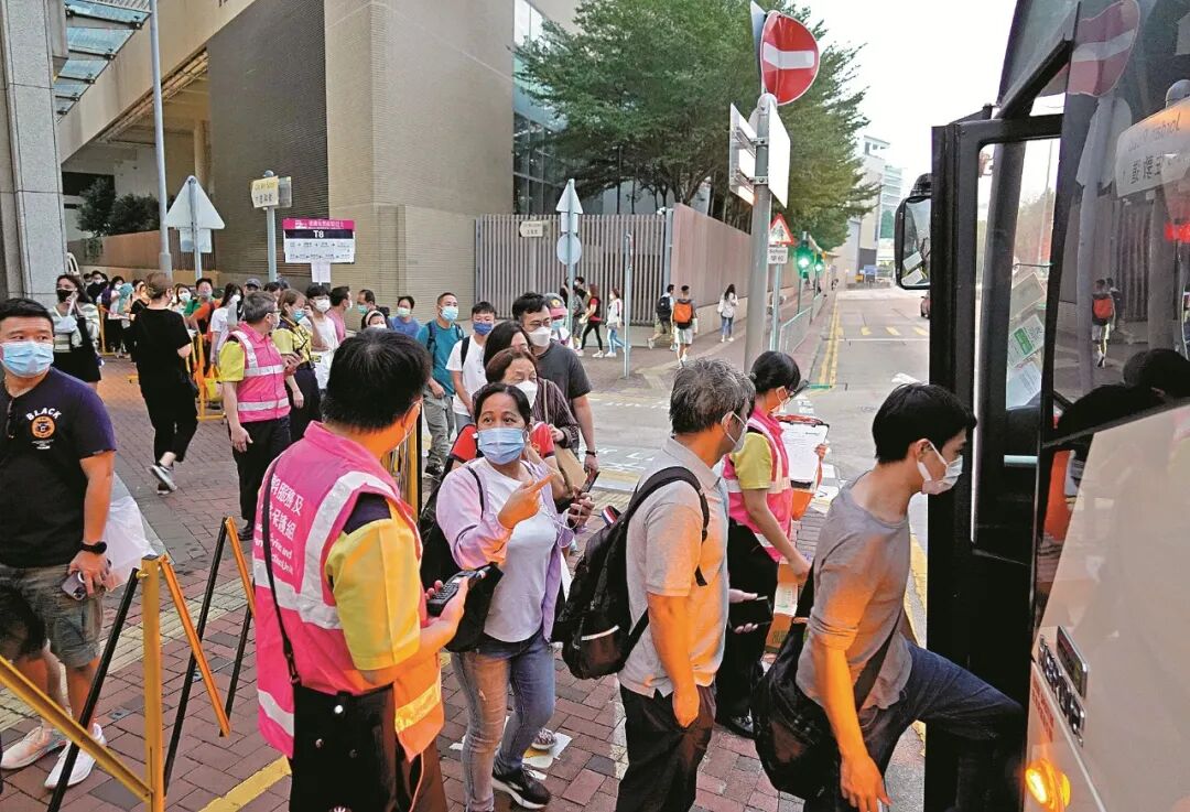 大批受影響乘客排隊改搭港鐵安排的穿梭巴士。(大公報記者林良堅攝)