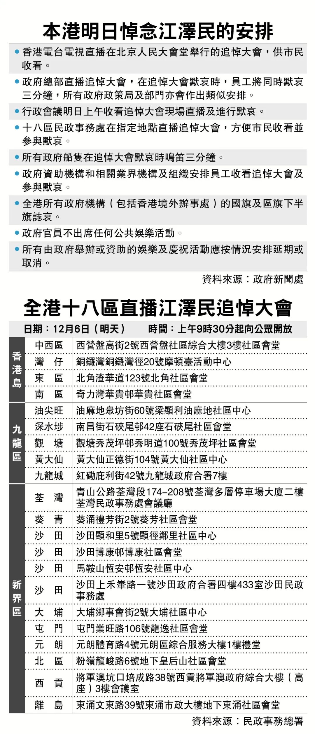 為表達對江澤民同志的深切哀悼,特區政府和市民將與內地同胞一同進行悼念。明日,所有政府機構,包括香港境外辦事處的國旗及區旗會下半旗誌哀,政府官員不出席任何公共娛樂活動,所有由政府舉辦或資助的娛樂及慶祝活動應按情況安排延期或取消。