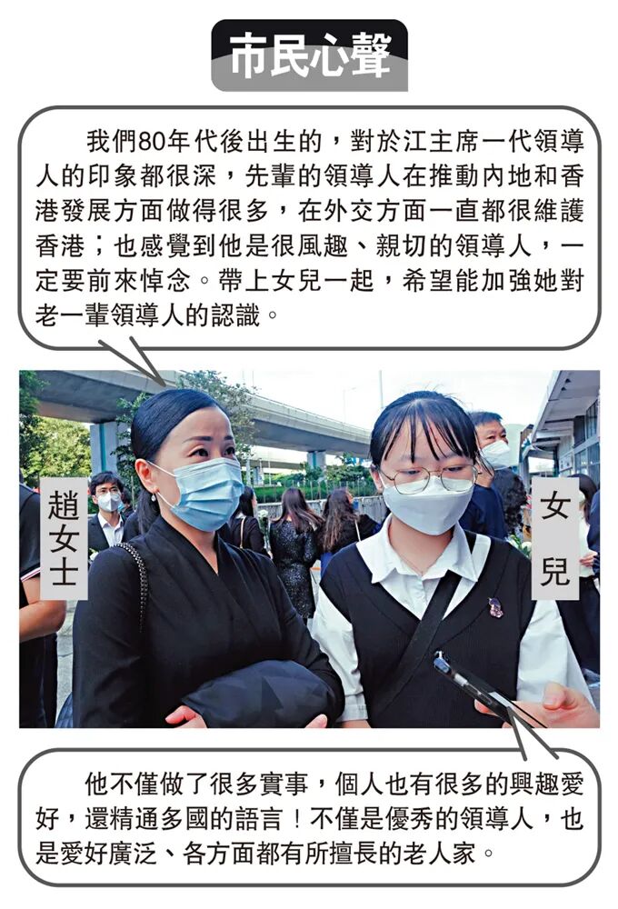 趙女士趁昨天星期日帶12歲女兒淇淇到來。趙女士說,江澤民在推動香港發展方面做得很多,希望女兒加深認識老一輩領導人。她說前往悼念途中發生小插曲,「從地鐵站出來,結果一路走錯,多走了三、四公里路,但來悼念都是值得!」淇淇說,雖然是在江主席離世後才逐漸了解這位老人,但知道他做了很多實事,個人有很多興趣愛好,精通多國的語言,令人欽佩。