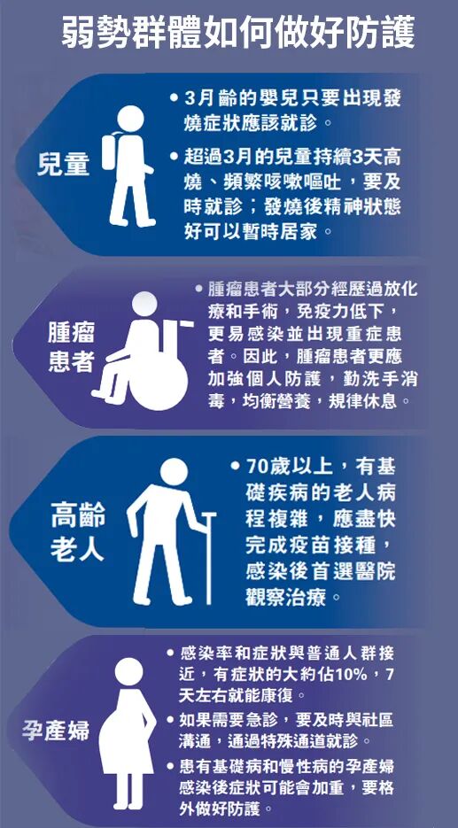 童朝暉表示,高齡老人,有心腦血管疾病、慢性呼吸道疾病等基礎病的患者,正在進行放化療的腫瘤患者,妊娠晚期孕婦等,免疫力較低,可歸納為脆弱群體。