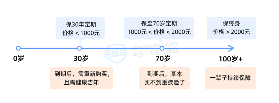 保定期:无论保 30 年或 70 岁,价格较便宜,但到期后就会失去保障,这时候重新买重疾险不仅价格更贵,而且万一身体条件变差,可能买不到了。