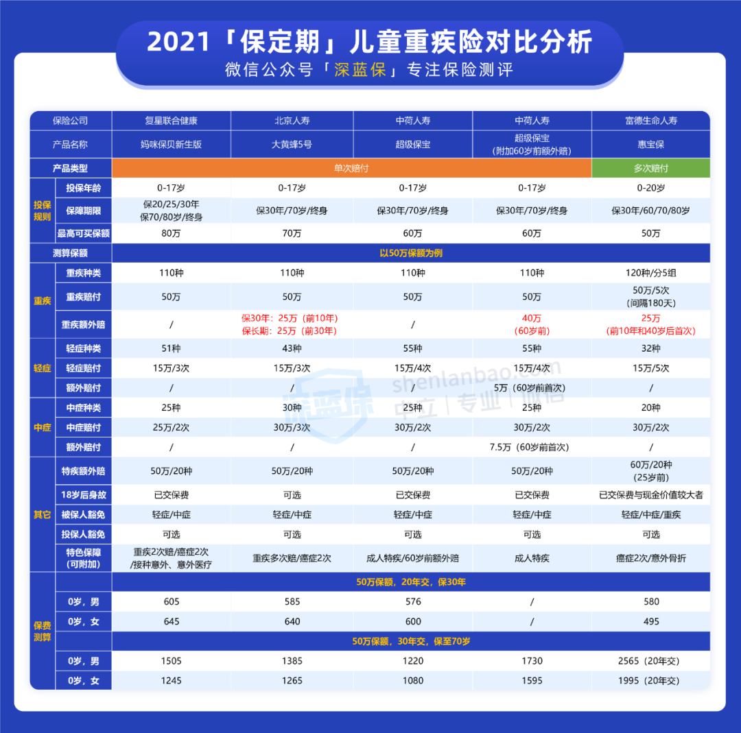 预算 1000 内:可考虑保 30 年的 惠宝保 和 大黄蜂 5 号,在前 10 年重疾都能多赔 50% 保额,其中惠宝保的少儿特疾赔的更多。妈咪保贝 价格贵些,不过有忠诚客户权益,到期能免健康告知,免等待期续保新品,详细测评可以点击这里查看 >>>