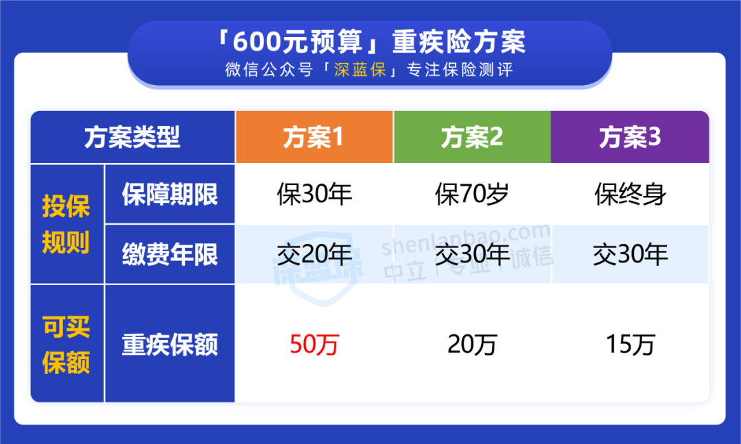 买重疾险就是买保额,几百块预算情况下,我们建议首选方案 1。虽然保障时间仅 30 年,但有 50 万充足的保额,能有效地抵御风险。