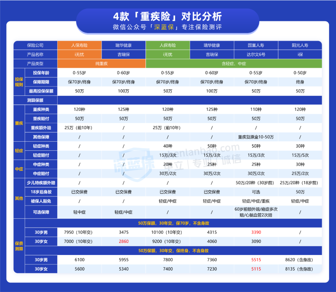为方便直观对比,我们加入了目前市面上其他 3 款重疾险,一起来看看: