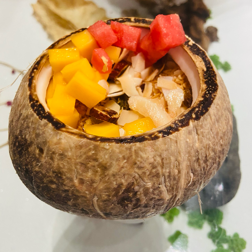 清补凉之美味滋补,令美食家苏东坡先生也不禁以“椰树之上采琼浆,捧来一碗白玉香”来称赞。传统的清补凉是以椰子水或椰奶和红糖水作底,共会选用配料几十种,有食疗作用,使清补凉成为中国一道有名的药膳。其中,冬瓜薏也是不可或缺的——这是一种用木薯粉制成的丸子,状如白玉,嚼劲十足。地处热带的海南是椰子之乡,店家采用当天现摘的新鲜椰子已经是当地不成文的规定。椰汁要用老椰熬制,而椰肉则要用幼椰,才更细嫩顺滑。带着冰渣清香醇甜的椰汁,细腻顺滑的椰肉,再加上冬瓜薏、红豆、红枣等温补的配料,清补凉不仅消暑而且富有营养。