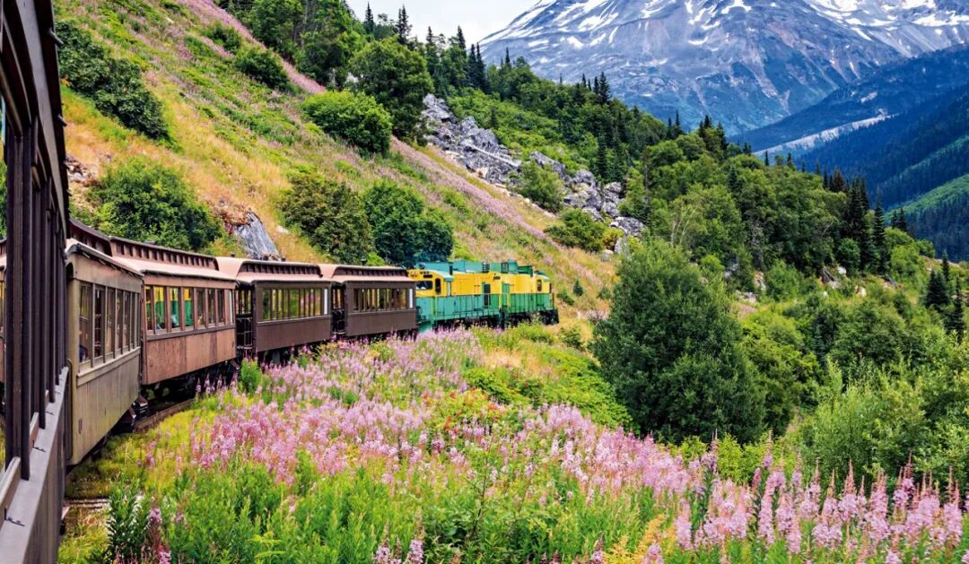 19世纪末加拿大西部的“克朗代克淘金热”浪潮,让斯卡圭(Skagway)发展成为重要的淘金客集散地。斯卡圭有一条专门为当年的淘金客修建的怀特山口和育空铁路(White Pass & Yukon Route)。直到金矿被开采枯竭,这条铁路才渐被废弃。20世纪80年代,随着阿拉斯加旅游业的发展,这条铁路经过修复后再次开门迎客,如今,它只抵达怀特山口美加边境处的班奈特湖畔。穿过一条条隧道后,列车来到怀特山口,从此进入加拿大的领土,地势也开始变得平缓。最后,列车缓缓停在班奈特湖畔的车站。班奈特湖就像一块湛蓝的宝石镶嵌在高山之上。