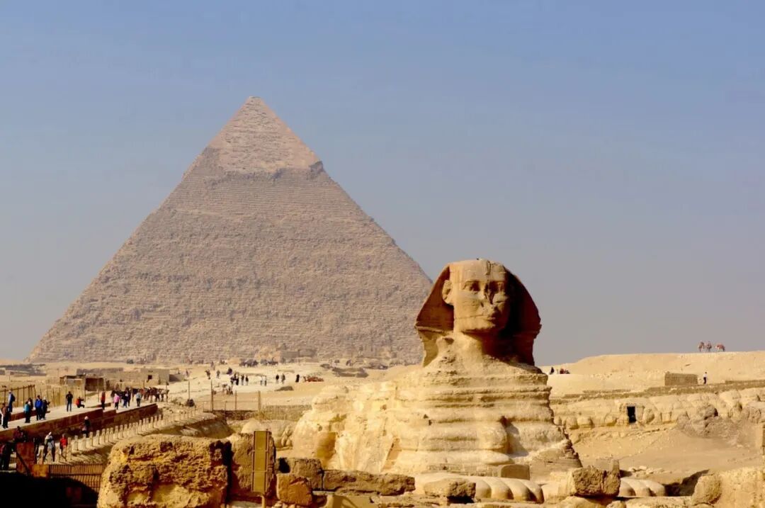 离胡夫金字塔不远处,狮身人面像趴立在哈夫拉金字塔前,犹如希腊神话中的怪物司芬克斯。狮身人面像到底是由胡夫还是其儿子哈夫尔法老下令建造的,考古学界尚有争议,与它有关的神秘故事也层出不穷。