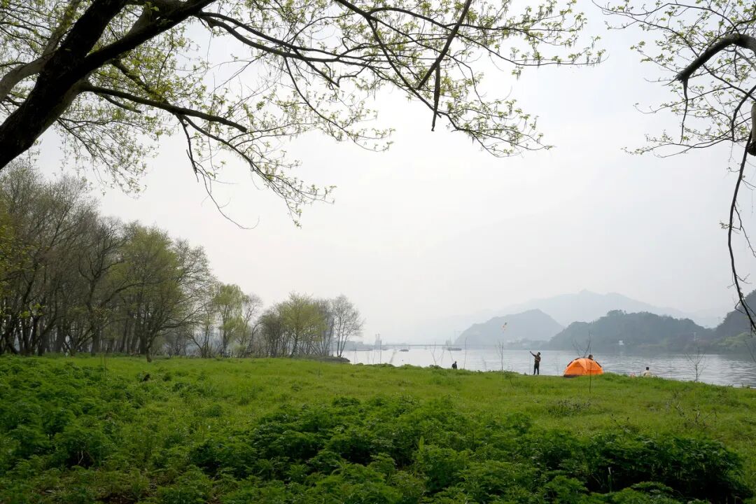 桐洲岛,是近年愈发热门的富阳露营地。除去传统的露营配套设施和项目外,桐洲岛上有提供皮划艇、摩托艇等水上项目,还有动力伞、热气球等飞行项目。搭配徒步和自行车这样的出行方式,露营者可以从多种角度体会《富春山居图》中的山水意境。