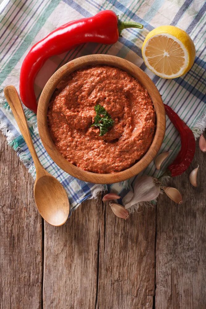 阿勒颇辣酱是以上文所提到的城市阿勒颇所命名的。它以阿勒颇出产的辣椒、碎核桃仁、橄榄油以及面包屑混合在一起制作而成,吃起来显得很有层次。搭配皮塔饼是不错的选择。
