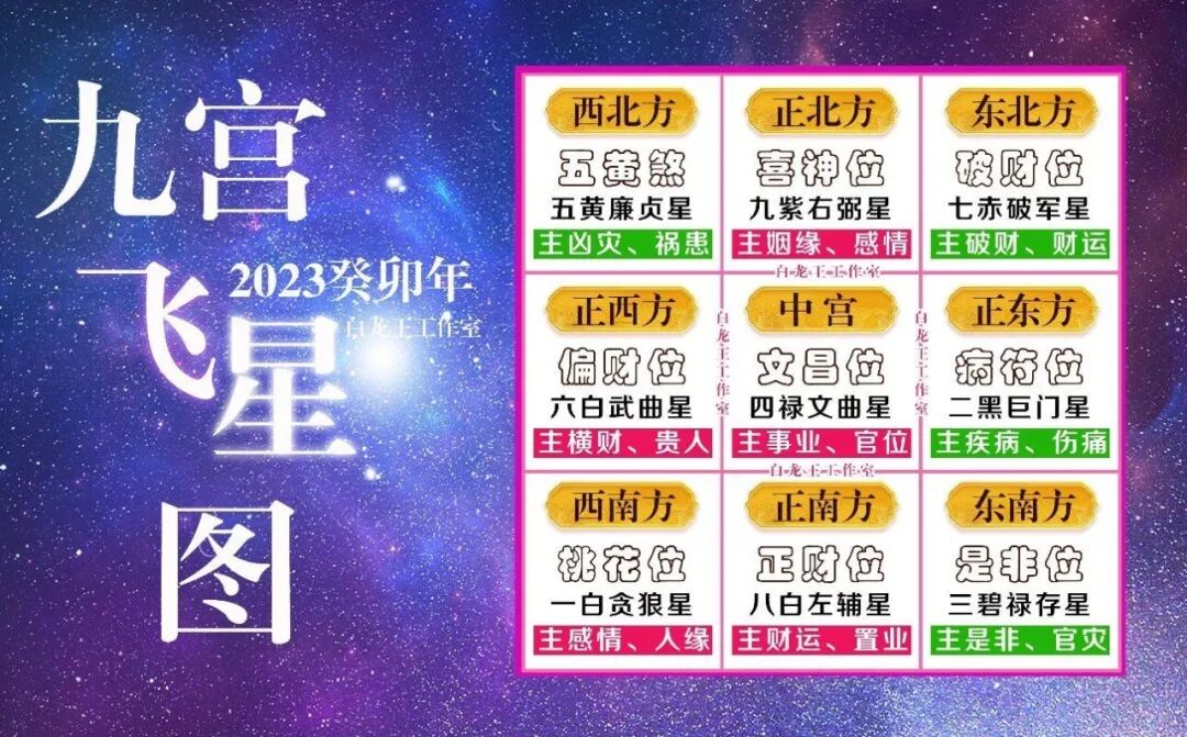 九宫飞星源于洛书与河图,暗合阴阳之奥.秘,天地之玄.机。正所谓“FS轮流转”,每一年的九宫飞星图都在变化,流年不同,各个方位就有不同的能.量与磁场,从而影响人类的吉凶huo福。白龙王小编为善友们提供2023年的流年飞星与宫位之间的吉凶预测,希望对善友们有所帮助。