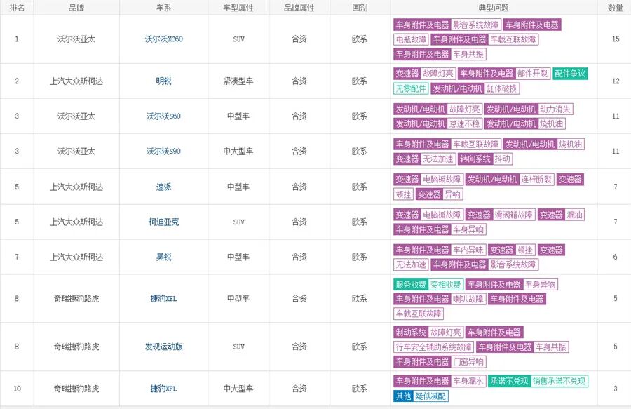 除此之外,在第三方汽车投诉平台中,关于沃尔沃的投诉也并不少见,有趣的是,尽管欧系品牌(不包括德系、法系)在国内的保有量少之又少,但沃尔沃还是凭借沃尔沃XC60、沃尔沃S60等车型在欧系车投诉中问鼎,而其中问题更是五花八门,影音故障、发动机动力消失、变速箱无法加速/故障等等紧紧缠绕着保有量、销量并不高的沃尔沃。