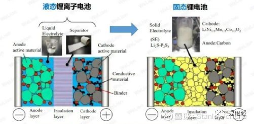 和液态电池相比,半固态/固态电池最大的特点在于引入了固态电解质。以取代现有的电解液+隔膜的电池构成。但半固态电池和固态电池的结构又有所不同: