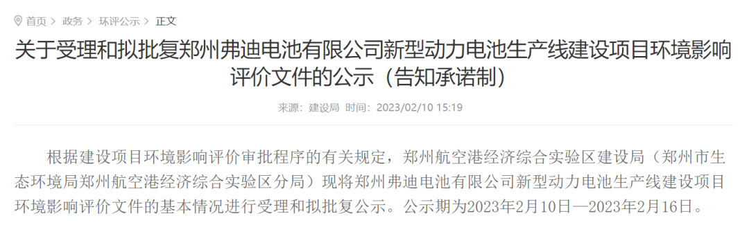 2 月 13 日,据郑州航空港经济综合实验区网站,根据建设项目环境影响评价审批程序的有关规定,郑州航空港经济综合实验区建设局 2 月 10 日将郑州弗迪电池有限公司新型动力电池生产线建设项目环境影响评价文件的基本情况进行受理和拟批复公示。