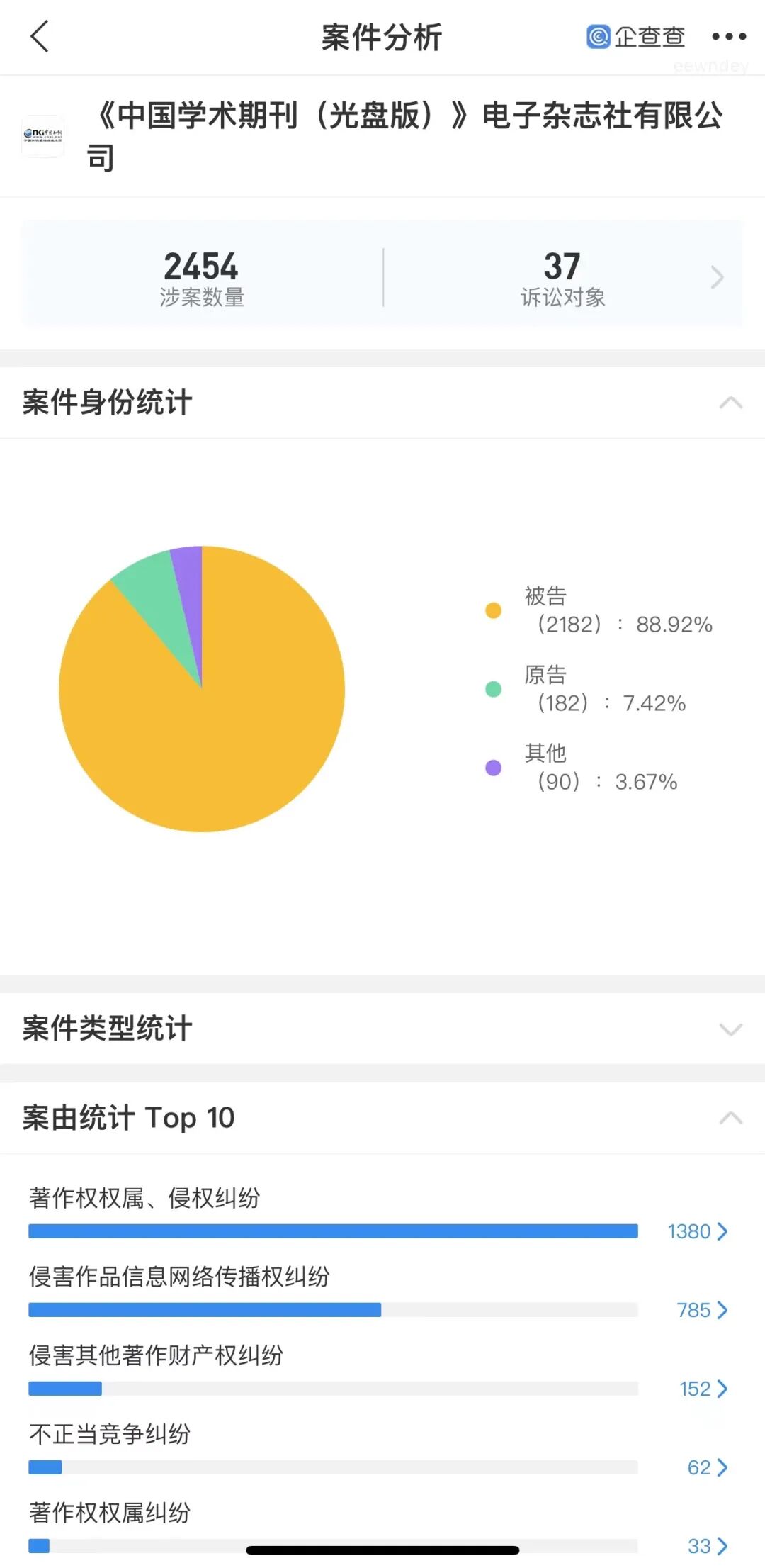 企查查App显示,知网运营主体《中国学术期刊(光盘版)》电子杂志社有限公司涉及的民事案件共有2454起(作为被告占比近89%),其中有1380起涉及著作权权属、侵权纠纷,785起涉及侵害作品信息网络传播权纠纷。