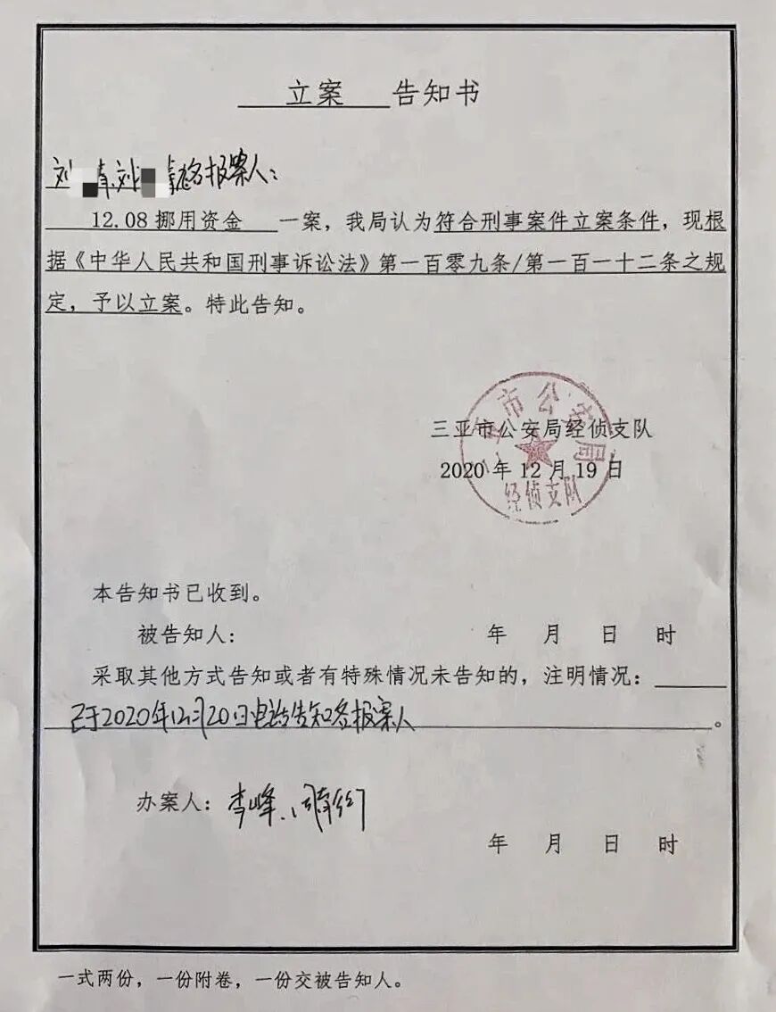 月,三亚市公安局向受害人送达《立案告知书》,认为符合刑事案件立案条件,决定立案侦查,该案目前正在侦查阶段。