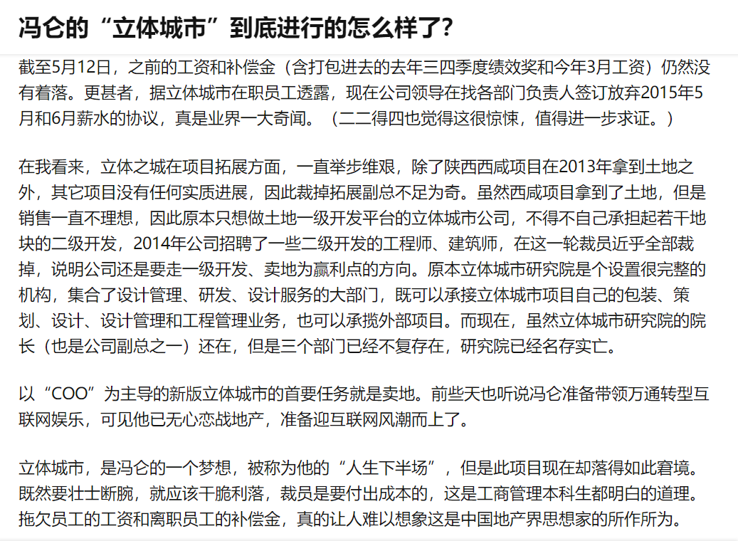 2016年,一名万通前员工对“立体城市”及冯仑的评价。图源知乎
