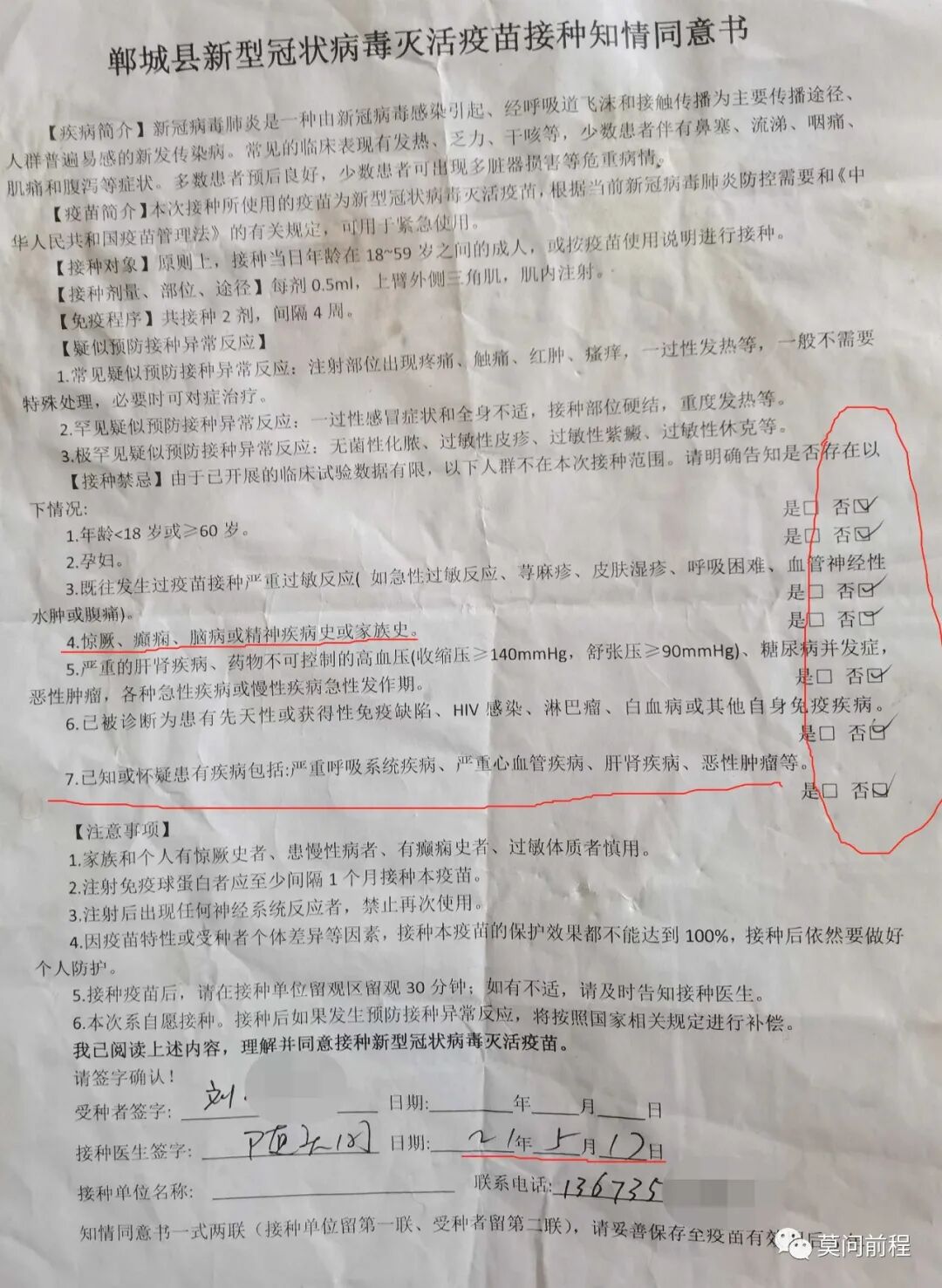 到地方,他们拿个准备好的《郸城县新型冠状病毒灭活疫苗接种知情同意书》 让签字,里面“否”字后面画的对号是他们工作人员提前画好的,然后也没做任何身体检查和询问就直接打了。接种完后观察半个小时就让回家了。