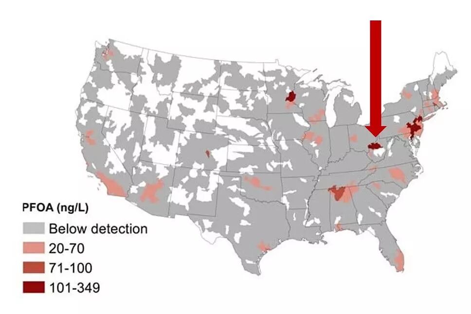 但是随后,罗伯便在农场亲眼目睹了坦南特射死了一头发疯的奶牛。他终于意识到,这件事没有这么简单。1999年,罗伯收到了来自杜邦的物证,其中PFOA被反复提及,但是关于这几个字母的意义,却搜不到任何线索。这次杜邦终于翻脸,破口大骂后甩了一句“Sue me”.杜邦为罗伯带来了几百箱文件资料,试图在取证环节就难倒罗伯。偌大的房间里,密密麻麻的文件资料像是一个牢笼一样把罗伯困在其中。由3M公司发明后改名为C-8,后来杜邦公司用它们研发了特氟龙。特氟龙渗透了生活的方方面面,最著名的产品就是不粘锅。不仅如此,有些油漆涂料,雨伞,皮革制品等都含有特氟龙。而含有C-8的特氟龙进入人体后很难被分解,长期积累甚至会致癌。下面的这张图是美国环境污染网站的PFOA的分布图,不难看出,PFOA浓度最高的地方之一,就是电影中提到的杜邦工厂所在的西弗吉尼亚州。