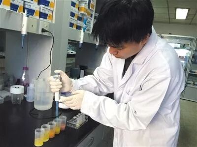 实验人员正在将5种果汁样品提取至离心管中 | 新京报