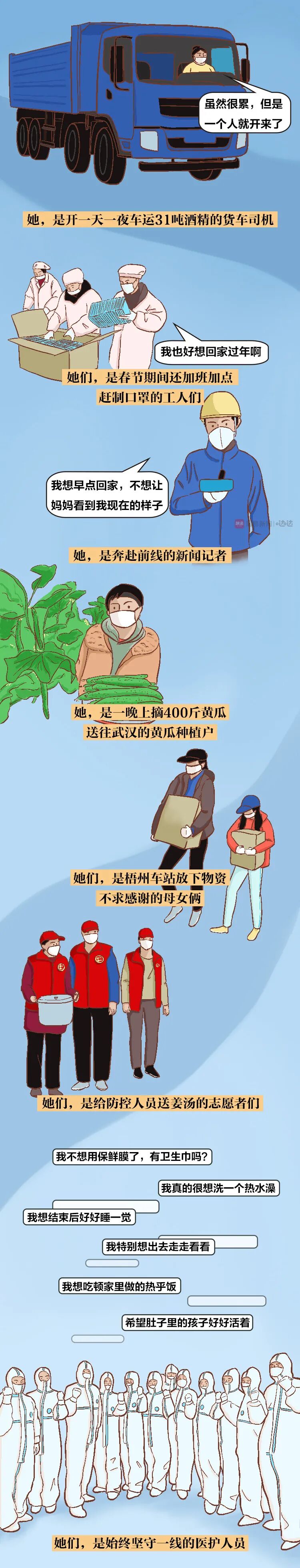 工作时,她们是日夜连轴转的医护人员、是不眠不休的建筑工人、是挺身而出的志愿者、是逆向而行的新闻工作者……