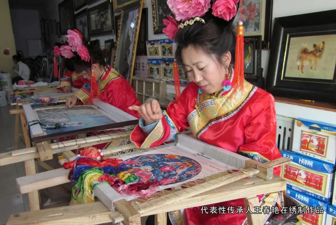 代表性传承人王春艳在绣制作品