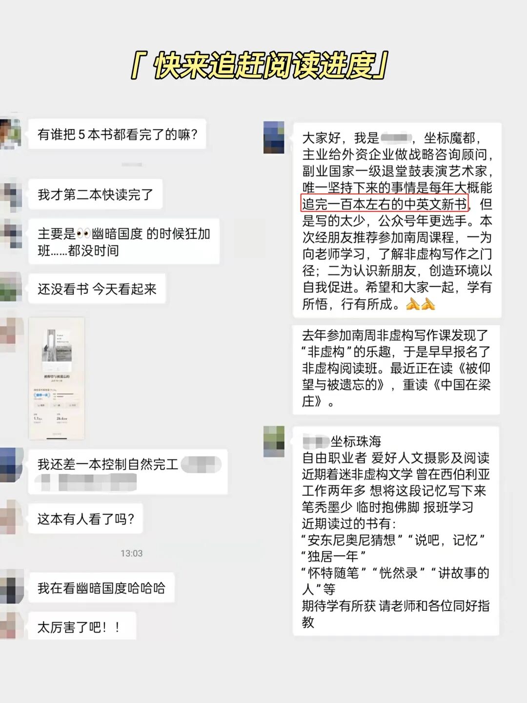 实战营3月11日即将正式开营,这两天已有学员陆续入群:他们或是常年与文字为伴的编辑、记者、自由撰稿人,或是想系统学习阅读写作,用非虚构记录生活点滴的老师、导演、IT从业者,抑或是第三次、第四次、甚至第七次参加南方周末课程,希望继续在阅读写作中深造的熟面孔……虽然他们遍布大江南北,甚至远在德国、奥地利,但不论身处何地,身任何职,阅读写作都是他们心底共同的热爱——从奈保尔、麦克菲聊到博尔赫斯、陀思妥耶夫斯基,从《中国在梁庄》《人类群星闪耀时》聊到《但是还有书籍》——拉群伊始,大家便碰撞出了无数火花。有学员感慨“之前报别的网课,都没有这群的气氛这么好”,更有学员已阅读完部分课程书目的中英文版,大家正迫不及待地交流读书创作心得。如果你也想在茫茫人海中与志同道合的书友为邻,在未来的47天里一同提高阅读写作能力,欢迎加入我们!一年仅此一期,错过再等一年!而且市面上由普通写手授课、带作业点评的课程,都动辄1000+元,而今天:25节音频课+5场直播答疑+47天社群伴读+作业点评其实问题的关键在于,我们习惯追求“速成”的外功,却常忽视写作的内力——“如果我有十分的时间,六分用来阅读,三分用来生活,一分用来写作。”“多读文学作品,去看看那些作品是怎么叙事、怎么把一个人写得活灵活现,在这个基础上去模仿,这就是内功。”因为即使是天才作家,也没有人能靠天赋或灵感写一辈子。国外职业化的写作训练,也需要学员们先阅读名著,然后临摹,再形成自己的语言体系。但为什么很多人明明读了很多书,下笔时还是一片苍白?能否从阅读中汲取写作养分,从来不在于你读了多少,而在于你读懂了多少。就像作家毕飞宇所说:“人家好在哪你都看不出来,你自己反而能写好,这是说不通的。”反观那些写作高手,其实都能透过文字表面,读懂其中的写作技法,然后化为己用。比如南派三叔读金庸时,并不仅沉溺于故事情节,他早就开始“琢磨多少字内这个人物说了几句话,这些话指向哪个情节点,为什么要这么写”。等把金庸的小说拆得只剩一个骨架时,他再把自己的故事情节往里边塞。