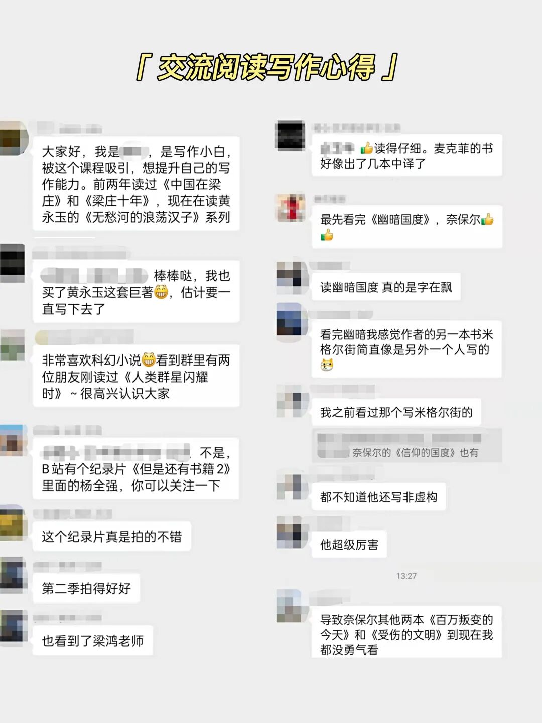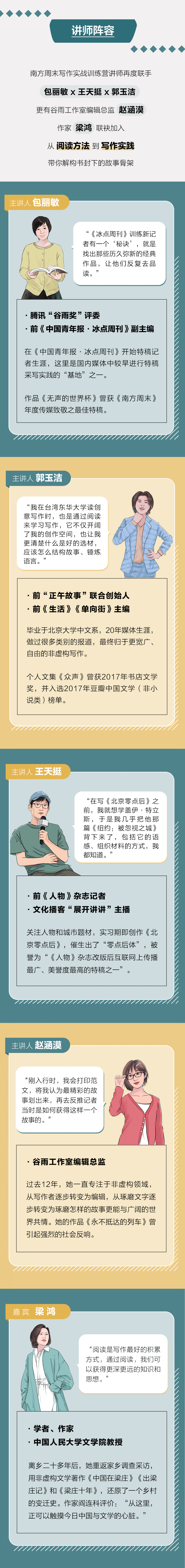 所以社群里每天都能收到学员的表白,以及无数催更的消息。人民文学奖得主梁鸿、前《中国青年报·冰点周刊》副主编包丽敏、前“正午故事”联合创始人郭玉洁、前《人物》杂志记者王天挺、谷雨工作室编辑总监赵涵漠![]()