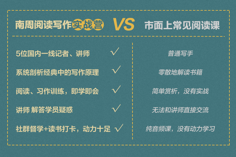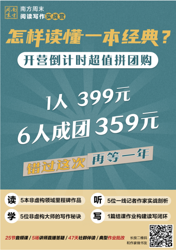 那《阅读写作实战营》究竟有什么魅力,让2000+学员催着我们上新呢?当“15分钟读完一本书”“21天成为写作高手”成为流行,我们却想放慢脚步,通过“沉浸阅读-分析阅读-背景阅读”的“三次阅读法”,帮助大家习得一套系统的阅读写作方法,真正读出可持续的写作力。人民文学奖得主、腾讯“谷雨奖”评委……将在为期47天的实战营中,用5步阅读写作法,带领大家像作家工作坊一样,在阅读中精进写作:第二步:独立阅读,并通过读书打卡,记录自己的阅读心得。第三步:听精读课,跟着讲师们再次细读文本,学习隐藏在文本下的写作原理。第四步:课程提问,讲师将通过直播的方式,解答大家的困惑。第五步:写课程作业,把从阅读中学到的写作方法运用到自己的创作中,讲师及助教团将选择代表性的作业进行点评。优秀的结课作业还有机会刊登在南方周末APP、新媒体“真实故事计划”、“谷雨实验室”或“蓝字计划”上。“在输出方面,往往身在此山中看不清楚自己的不足,定期的作业以及导师助教的批改非常有价值,很多时候就是醍醐灌顶。”一位传统媒体领域的学员说道。市面上由普通写手授课、带作业点评的课程,都动辄1000+元,而今天:25节音频课+5场直播答疑+47天社群伴读+作业点评![]()