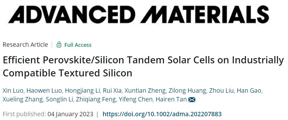 Luo, X., Luo, H., Li, H., Xia, R., Zheng, X., Huang, Z., Liu, Z., Gao, H., Zhang, X., Li, S., Feng, Z., Chen, Y. and Tan, H. (2023), Efficient Perovskite/Silicon Tandem Solar Cells on Industrially Compatible Textured Silicon. Adv. Mater.. Accepted Author Manuscript 2207883.