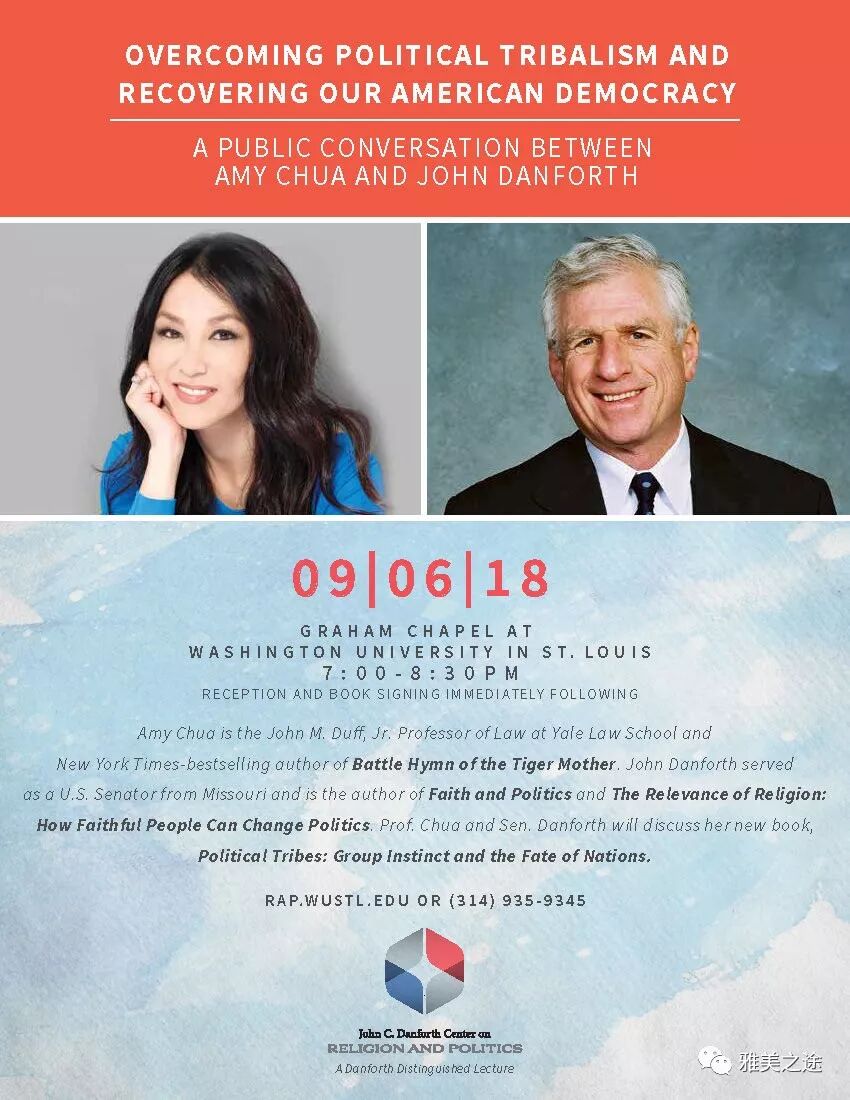 虎妈近期再度成为风云人物,新书《Political Tribes》(《政治部落》)出版几月,好评如潮。开学不久她受邀将于9月6日来圣路易斯华盛顿大学演讲,与耶鲁校友密苏里前参议员John Danforth共同登台,演讲的题目为“克服政治部落化和恢复我们美国的民主”。