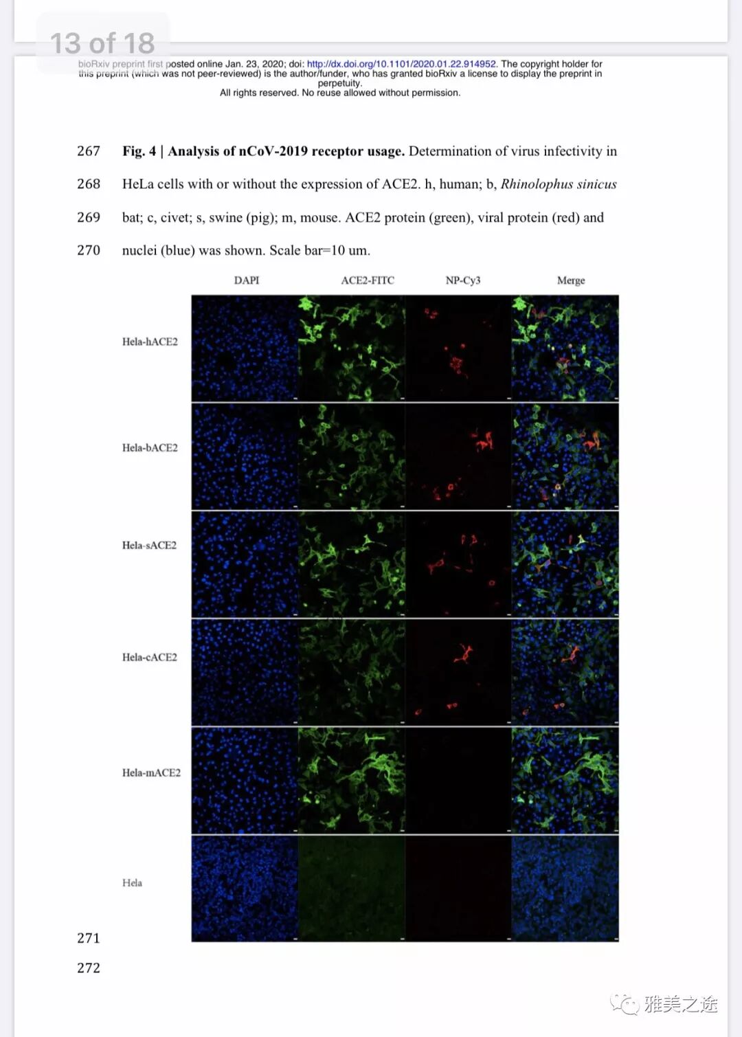 让我谈点论文的要点:她们参与发现了武汉冠状病毒,并做了深入的病毒学研究,为武汉扳回一城,虽然全序列在上海之后。武汉冠状病毒与非典病毒的核酸同源性大约80%,武汉冠状病毒与蝙蝠中的病毒具有高达96%的同源性,蝙蝠是非典病毒的宿主之一。另一个突破性的发现是, 武汉冠状病毒利用ACE2膜受体进入培养的肿瘤细胞中,而非典病毒正是通过ACE2膜受体进入细胞的。原代细胞标本的感染实验现在做起来太难,但是这些体外实验可以让我们思考病毒进入肺上皮细胞的情形,这会对药物设计与治疗产生深刻的影响。这里要强调的是,没有她实验室以前的深厚积累,根本不可能在如此短时间内找到武汉病毒的受体。所以沒有必要为了争时尚杂志,天天想着抢别人的热门课题。那是米兰时装设计师的目标,不是科学家的追求。
