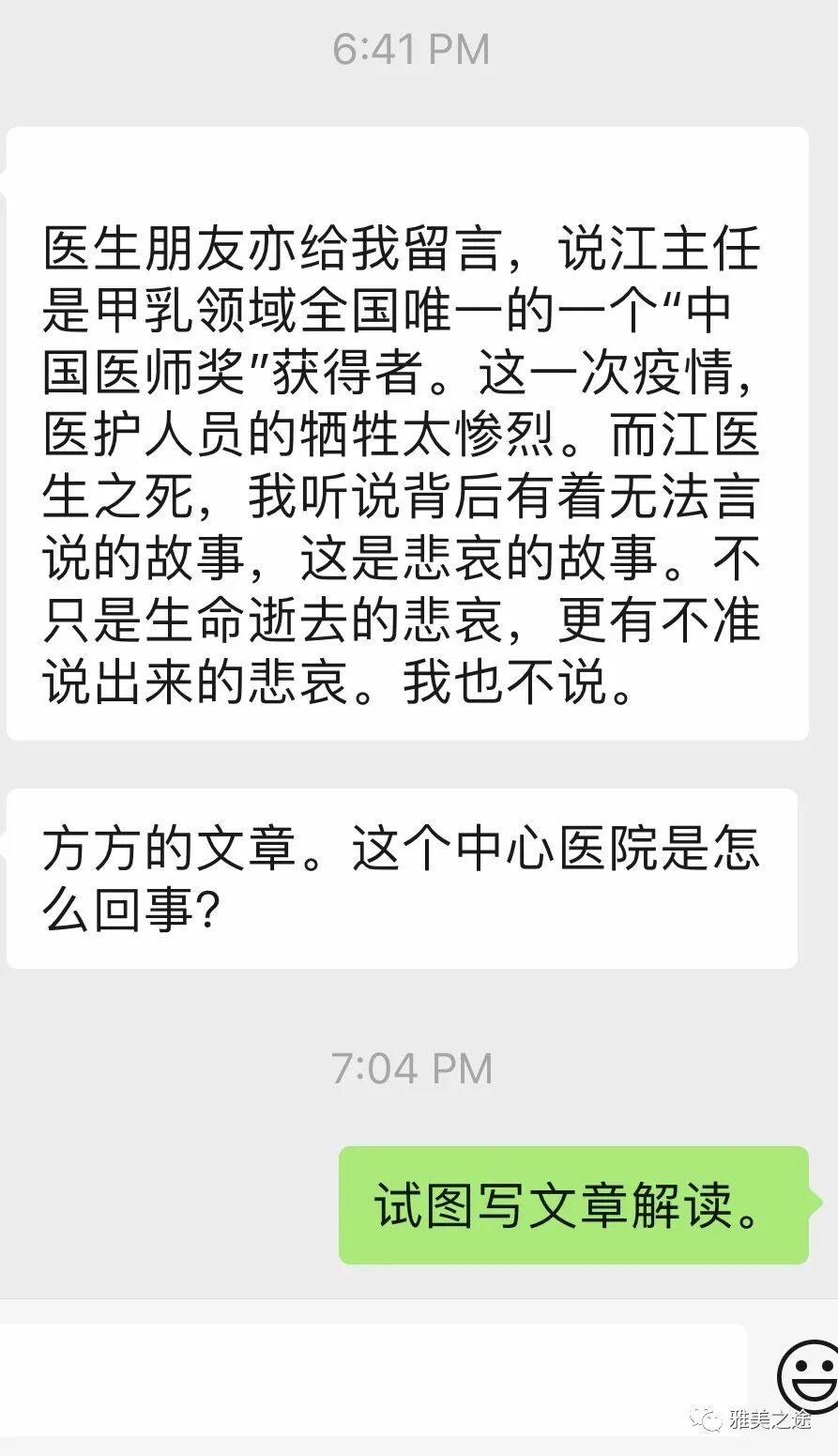 资深文学城网友在我博文后的留言:“我刚刚在读方方3月1日日记看到她在日记中提到江学庆医生的死。方方称江医生是一位温暖的医生,是甲乳领域全国唯一的一个中国医生奖获得者。不过,方方记录的一点令我感到有些蹊跷,她说,她听说,“江医生的死背后有令人无法言说的故事,是悲哀的故事,不止是生命逝去的悲哀,更有不准说出来的悲哀。我也不说”。无论如何,江医生的逝世已经进入方方日记,不会随着岁月的逝去而消失。方方和大家都不说的悲哀的故事最后也会有人说的。”