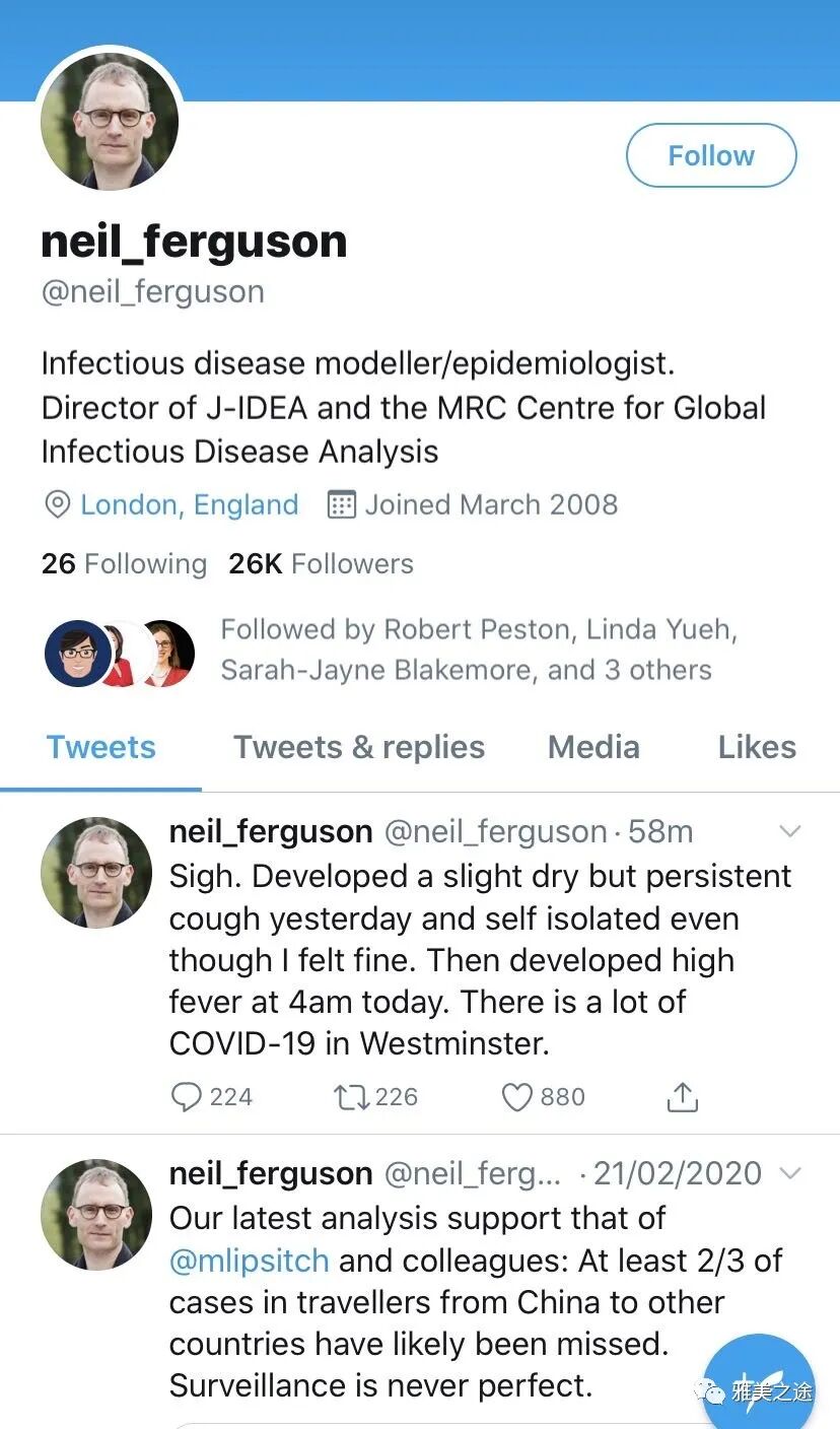 成功预测全球新冠疫情的英国帝国理工院士NeilFerguson也咳嗽和发烧,愿上帝保佑他,他是对新冠控制贡献巨大的学者。他所在的伦敦Westminster地区存在大量感染者,他称从中国到其他国家的感染旅行者中,2/3都沒有被发现,全球面临挑战。