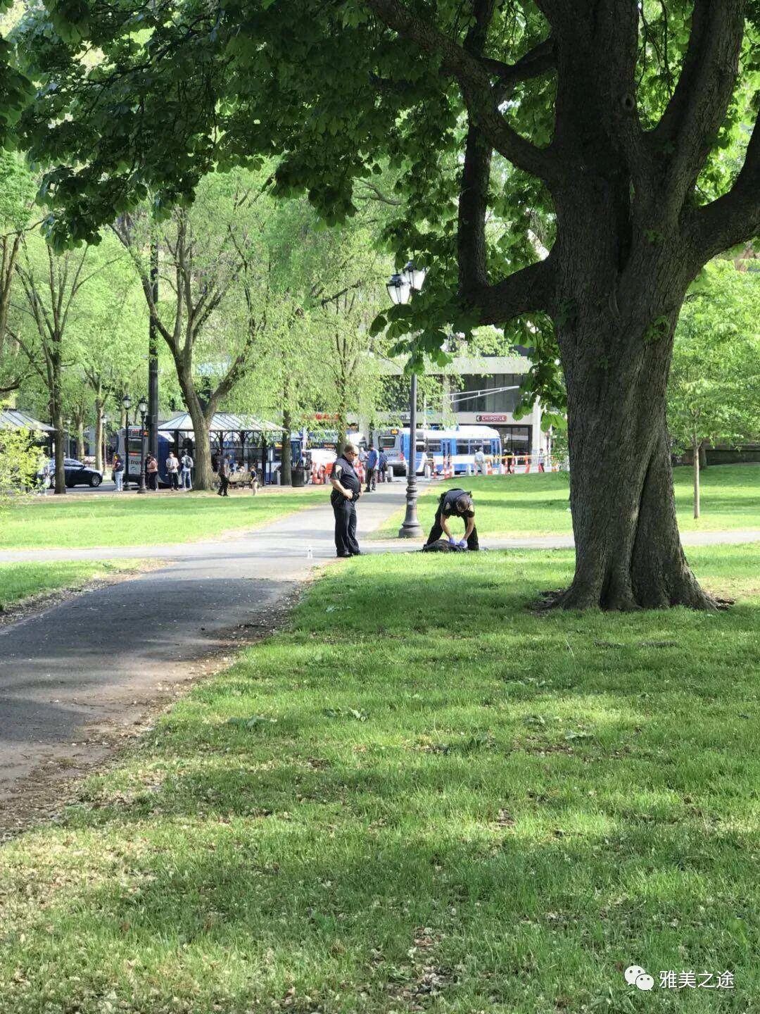 近些年耶鲁的治安状况有所改善,但是远非理想境界。这是我在2019年5月借去纽黑纹制药公司做学术报告,重返耶鲁校园的亲眼所见,位于耶鲁老校园正前方的纽黑纹绿地:“我从远处看时,以为他死了。现在从镜头可以看到他在打滚,打滚后警察拷他,为白人吸毒者,身体抽搐。公园周围全是黑人,戴手拷时,黑人喊police brutality [呲牙][偷笑]。第五张照片为另一位在耶鲁前草坪上的瘾君子,第六张则是在与耶鲁咫步之遥街道的无家可归者[疑问][疑问]”