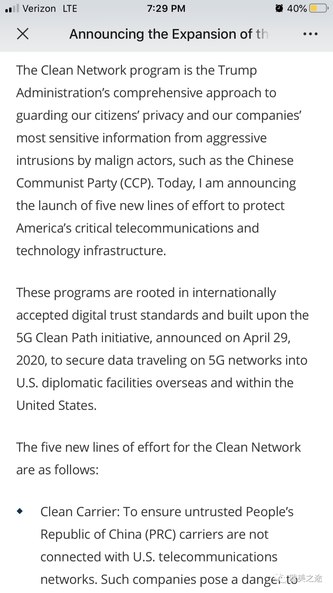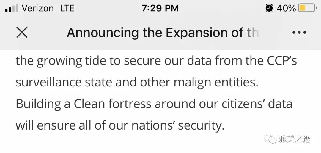 刚刚有个帖子引起了大家的关注,美国国务卿出台所谓“清洁网络政策”。我读了全文,沒见具体到多么细致,尤其沒见具体提到微信,这是我最关心的。