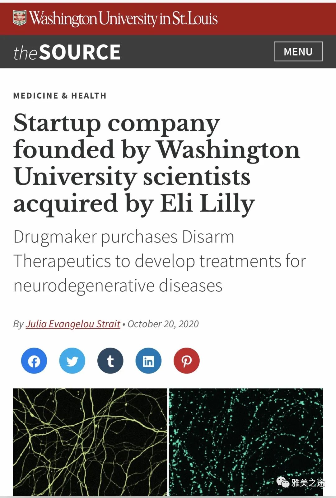 Milbrandt和DiAntonio的这个小公司是做神经科学的,我只能用英文解释,因为这些东西不知道中文怎么说。我们知道神经元用axon来传出信息,用dendrite接受信息。axon可以伸得很长,出现问题则会导致很多神经退行性疾病。Milbrandt发现了一种叫SARM1的酶在axon延伸中起重要作用,它能够杀死多种动物的axon,通过消耗掉axon延续所需的能量的方式。他们便创办名为Disarm Therapeutics的公司以寻找调节或封闭SARM1的生物制剂,这样就可以救那些频死中的axon,这对多发性硬化,张定宇所患的ALS和帕金森氏病等神经退行性疾病的意义重大。这些激动人心的科学进展引起了全球著名的EliLilly公司的关注, Lilly因为研发出治疗抑郁症的药物Prozac而全球闻名。有人预测Disarm Therapeutics的投资者,在未来可能获得高达12亿美元的回报。这些主要来自他们在2017年的那篇Neuron文章,仅几年的时间就创造出惊人的价值。